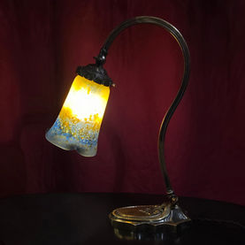 Cette élégante lampe à poser ou liseuse s'inscrit parfaitement dans l'esthétique organique de la période Art Nouveau. Elle se caractérise par son socle richement orné de motifs végétaux en relief, prolongé par un fin bras courbé typique dit en "col de cygne". Ce mouvement délicat vient suspendre une superbe verrerie en forme de tulipe à bord ondulé. Réalisée dans la technique du verre marmoréen (verre tacheté ou moucheté), cette tulipe non signée offre un contraste saisissant entre un jaune lumineux et un bleu profond. Éteinte, c'est un bel objet décoratif ; allumée, le verre révèle toute sa texture et diffuse une lumière chaude, douce et tamisée, idéale pour un bureau ou une table de chevet.